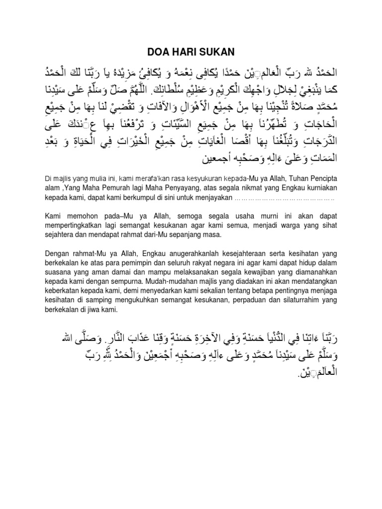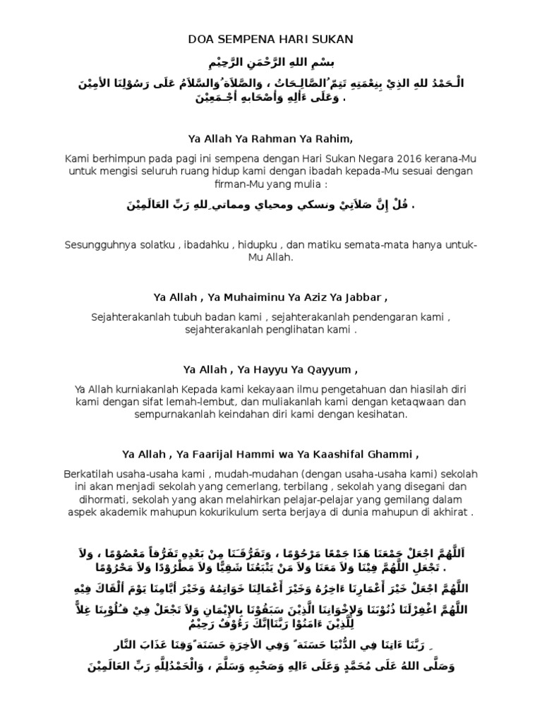 DOA SEMPENA HARI SUKAN بسم الله الرØÙ…Ù† الرØÙŠÙ… الـØÙ…د لله الذي بنعمته تتم Ø§Ù„ØµØ§Ù„Ù€ØØ§Øª والصلاة والسلام على رسولنا الأمين وعلى. Text of buku program hari sukan negara. Doa doa majlis rasmi sekolah spim jps murni.
